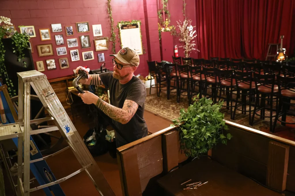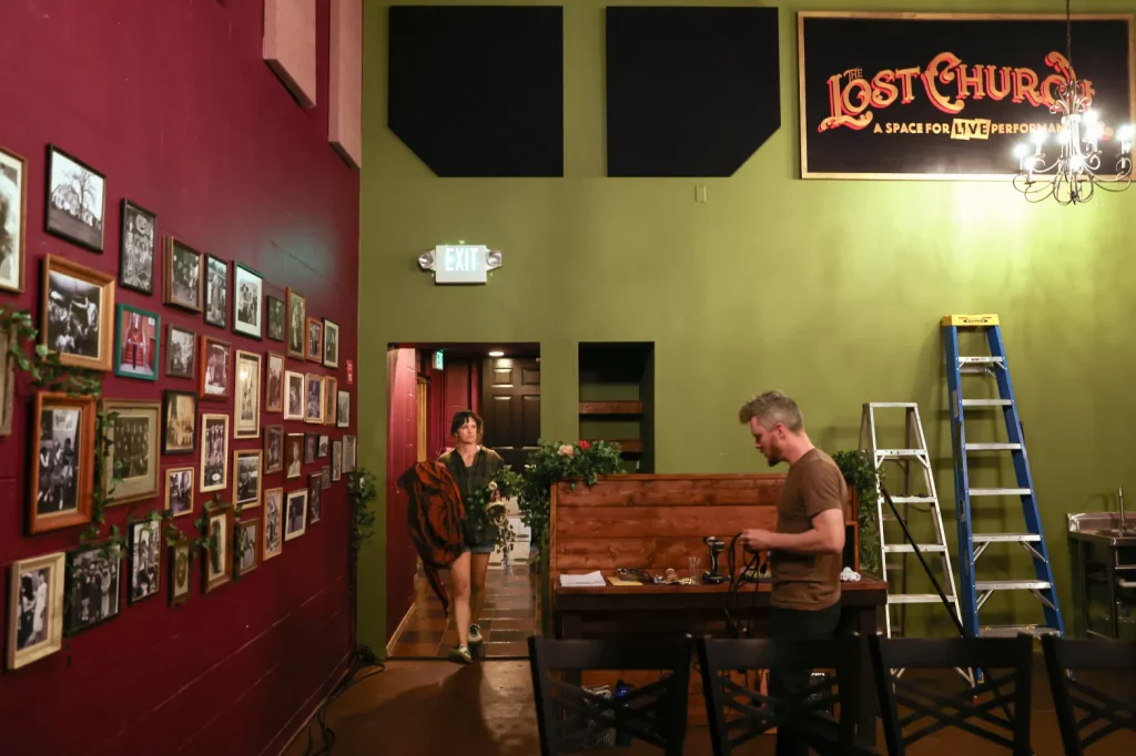Lost Church co-founders Brett Cline, Elizabeth Cline, left, and general manager Bryce Dow-Williamson work on decorating the venue’s new location, along Mendocino Avenue, in Santa Rosa on Thursday, March 26, 2026. (Christopher Chung/The Press Democrat)